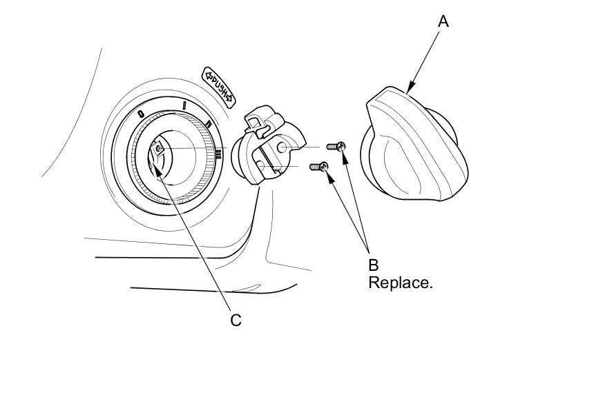 1. Remove the ignition switch knob (A). Then remove the two screws (B) and lower knob portion from the ignition key cylinder (C).