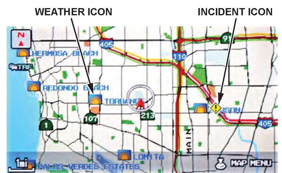 Current traffic information can be displayed by the system in many metropolitan areas. Information is displayed as traffic flow bands of different colors on selected roads, or as diamond-shaped icons.