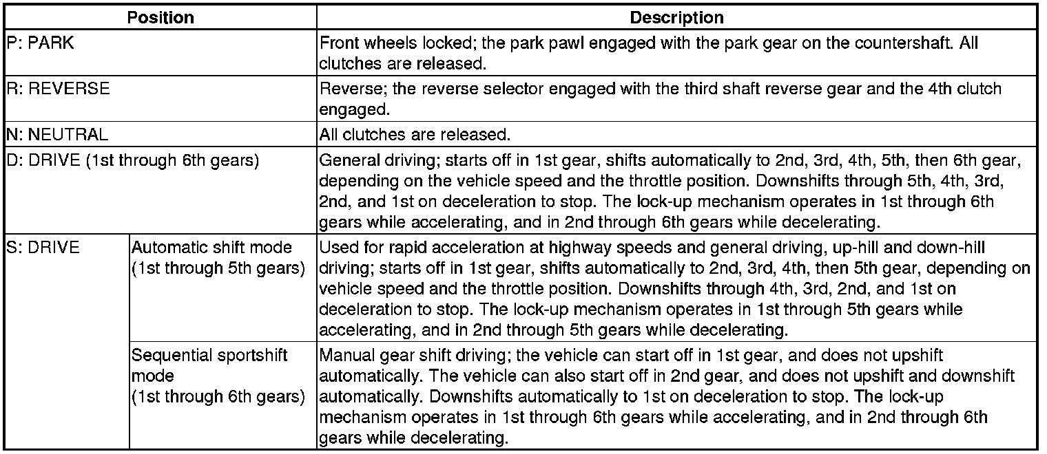The shift lever has five positions; P: PARK, R: REVERSE, N: NEUTRAL, D: DRIVE 1st through 6th gear ranges with automatic shift mode and D-paddle shift mode, and S: DRIVE 1st through 5th gear ranges with automatic shift mode and 1st through 6th gear ranges with sequential sportshift mode.