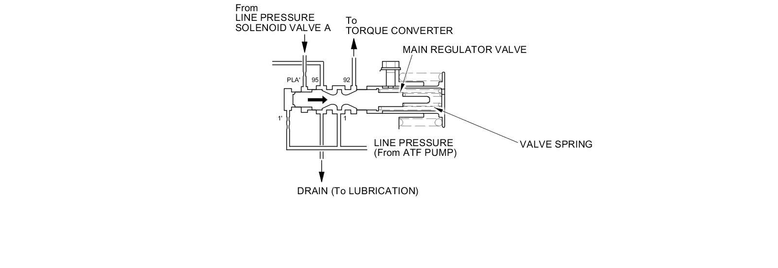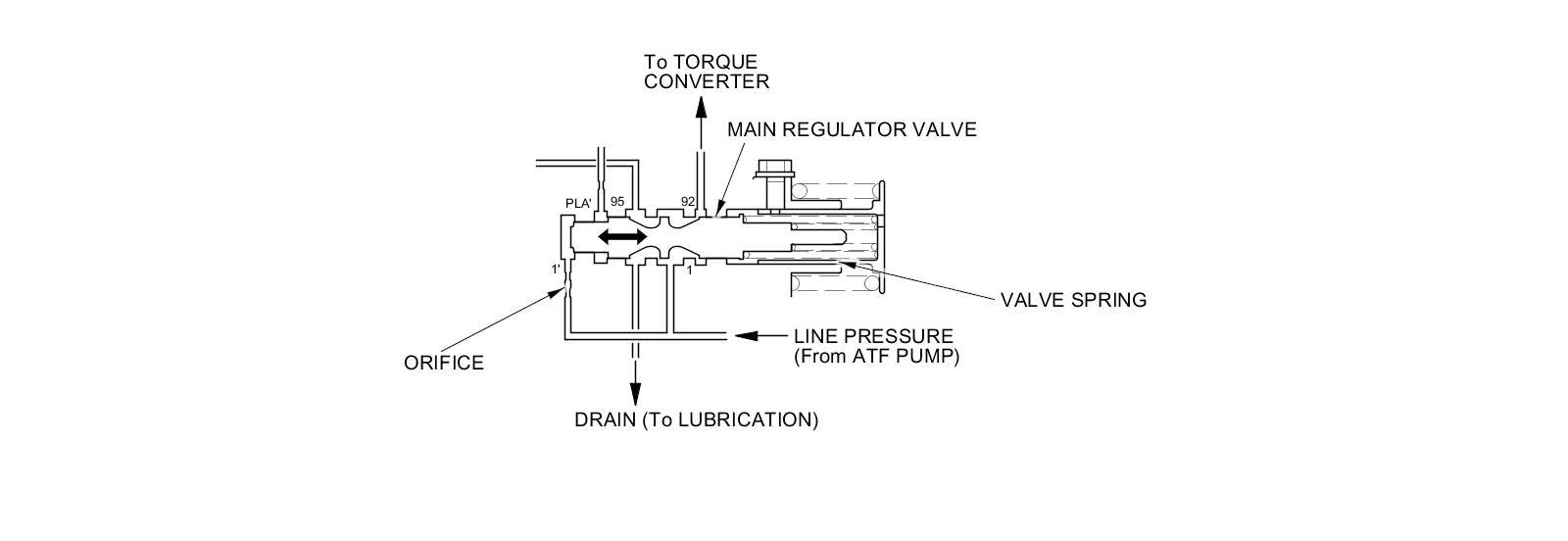 The main regulator valve maintains constant hydraulic pressure from the ATF pump to the hydraulic control system, while also providing fluid to the torque converter and the lubrication system. Fluid from ATF pump flows through the 1 cavity and the 1' cavity of the main regulator valve. Then the fluid entered in the 1' cavity pushes the main regulator valve to the spring side, this movement uncovers the fluid ports to the torque converter and the lubrication system on the main regulator valve. The fluid flows out to the torque converter and the lubrication system, then the main regulator valve returns under spring force when the pressure in the 1' cavity of the main regulator valve is lowered below that in the 1 cavity, which covers the fluid ports to the torque converter and the lubrication system. According to the level of the hydraulic pressure through the 1' cavity, the position of the main regulator valve changes, and the amount of fluid from the 1 cavity through the torque converter changes. This operation is continued maintaining the line pressure.