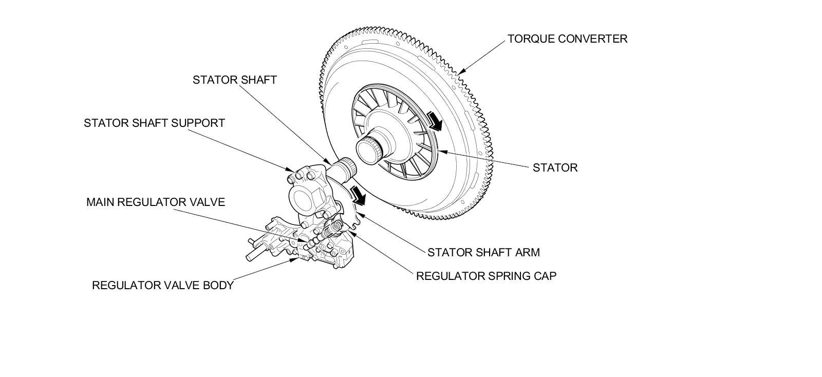 Increases in hydraulic pressure according to torque are regulated by the main regulator valve using stator torque reaction. The stator shaft is splined to the stator in the torque converter, and the stator shaft arm end contacts the regulator spring cap. When the vehicle is accelerating or climbing (torque converter range), stator torque reaction occurs on the stator shaft, and the stator shaft arm pushes the regulator spring cap in the direction of the arrow in proportion to the reaction. The stator reaction spring compresses, and the main regulator valve moves to increase the line pressure which is regulated by the main regulator valve. The line pressure reaches its maximum pressure when the stator torque reaction reaches its maximum position.