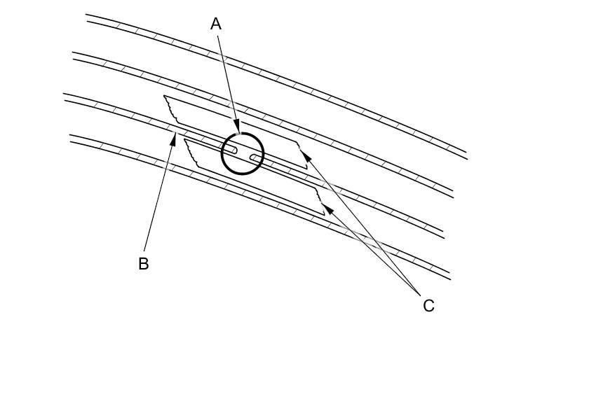 2. Carefully mask above and below the broken portion of the defogger wire (B) with cellophane tape (C).