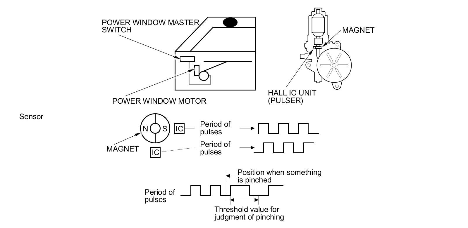 The power window motor incorporates a Hall IC unit (pulser) which generates pulses during the motor's operation and sends pulses to the power window control unit. As soon as the power window control unit detects a change in pulse frequency from the Hall IC unit (pulser), the power window control unit makes the power window motor stop and reverse. This prevents pinching your hand or fingers during auto-up operation. The auto reverse function does not work when the driver's window switch is held in the up position.