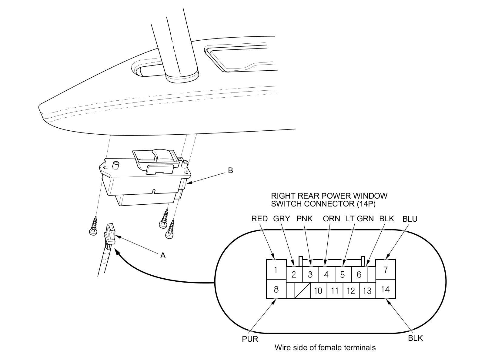 3. Disconnect the 14P connector (A) from the right rear power window switch (B).