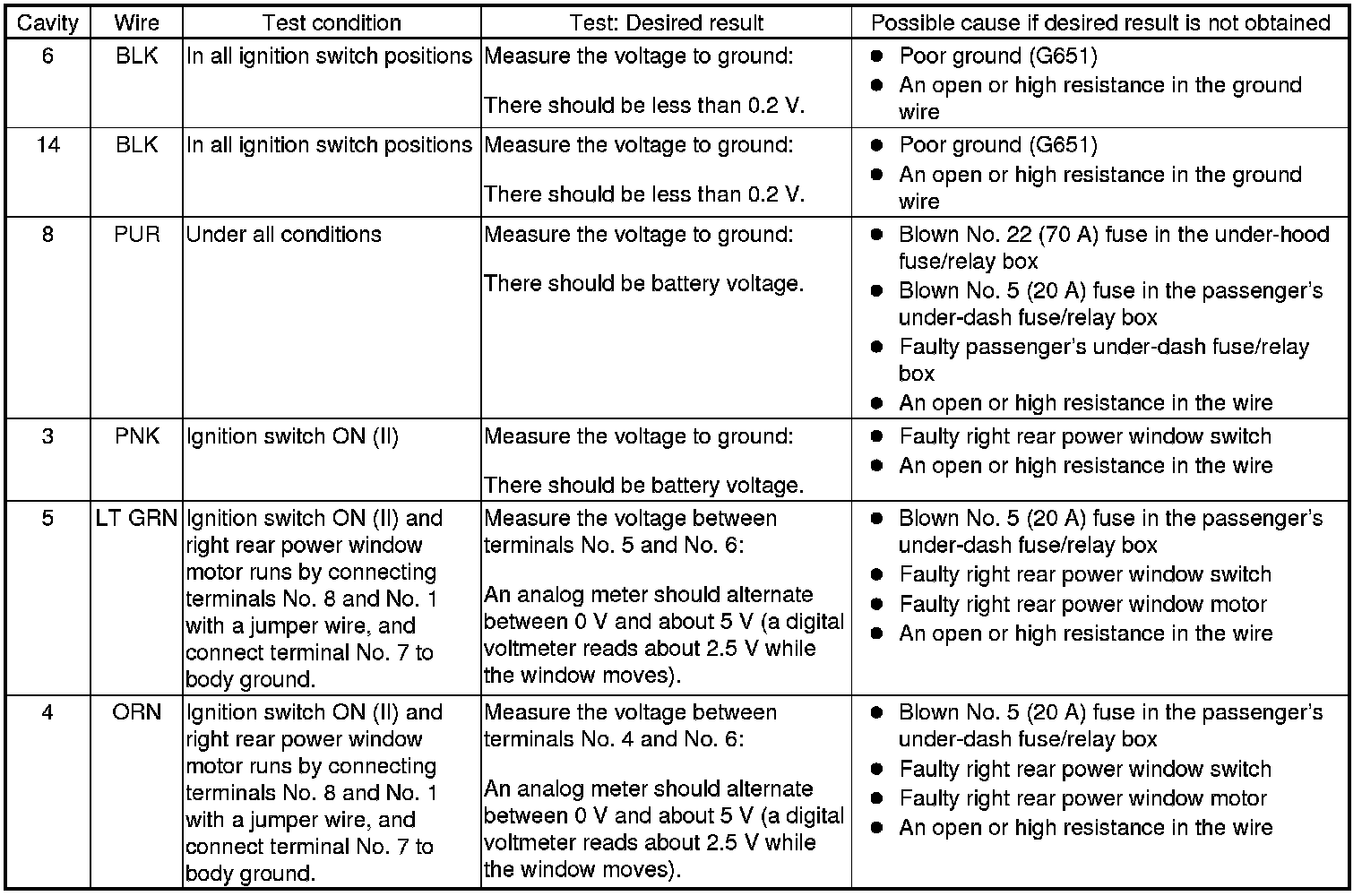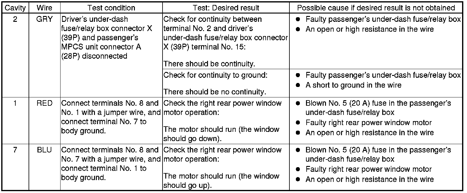 - If all the input tests prove OK, the right rear power window switch must be faulty; replace it Passenger's Power Window Switch Test/Replacement and go to step 7.