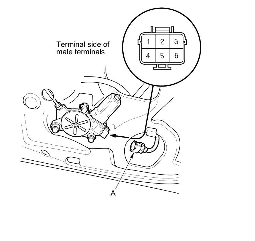 2. Disconnect the 6P connector (A) from the power window motor.
