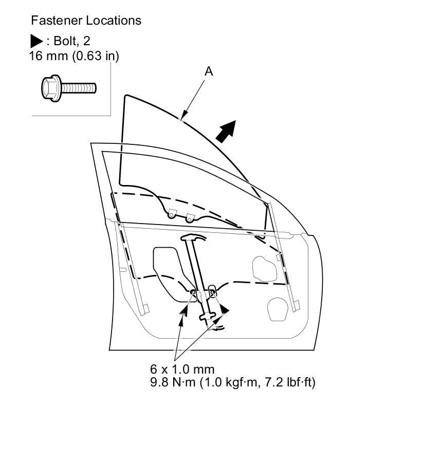 2. Carefully move the glass (A) until you can see the glass mounting bolts, then remove them. Carefully pull out the glass through the window slot. Take care not to drop the glass inside the door.