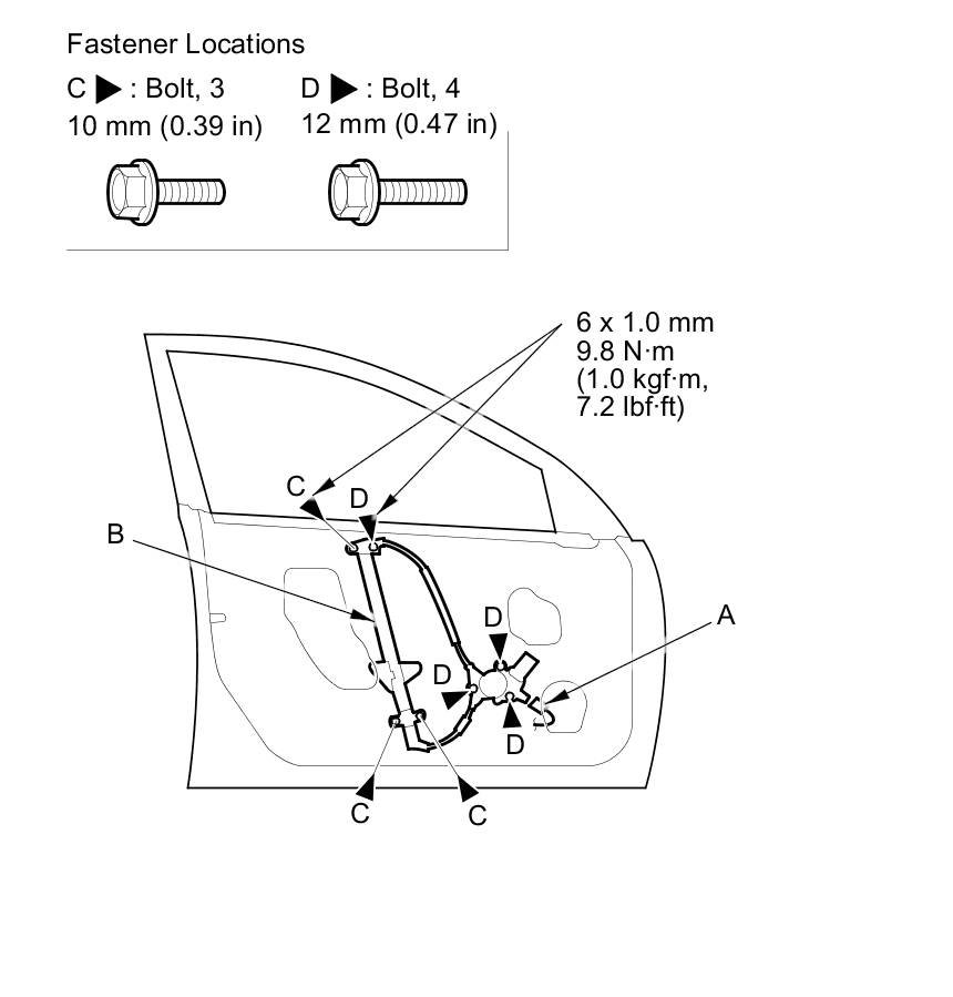 4. Remove the bolts (C), and loosen the bolts (D), then remove the regulator through the hole in the door.