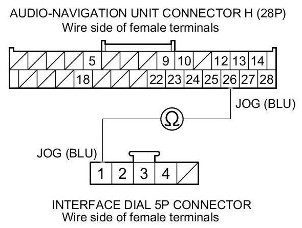 8. Check for continuity between audio-navigation unit connector H (28P) terminal No. 26 and interface dial 5P connector terminal No. 1.