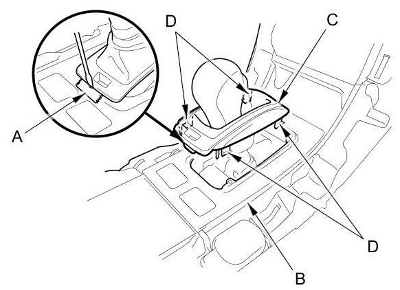 3. A/T: Apply the protective tape (A) to the A/T shift panel (B) along the side edge of the shift lever boot base (C). Pry up on the edge of the shift lever trim with a flat-tipped screwdriver to release the hooks (D).