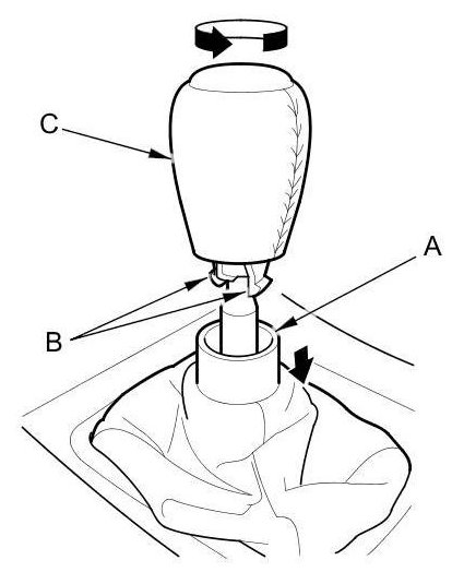4. M/T: Lower the shift lever boot (A) to release the hooks (B) from the boot, then remove the shift knob (C).