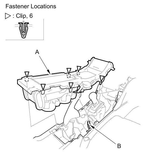 6. Detach the clips by pulling up the center console panel (A). Disconnect the accessory power socket connector (B), then remove the console panel.
