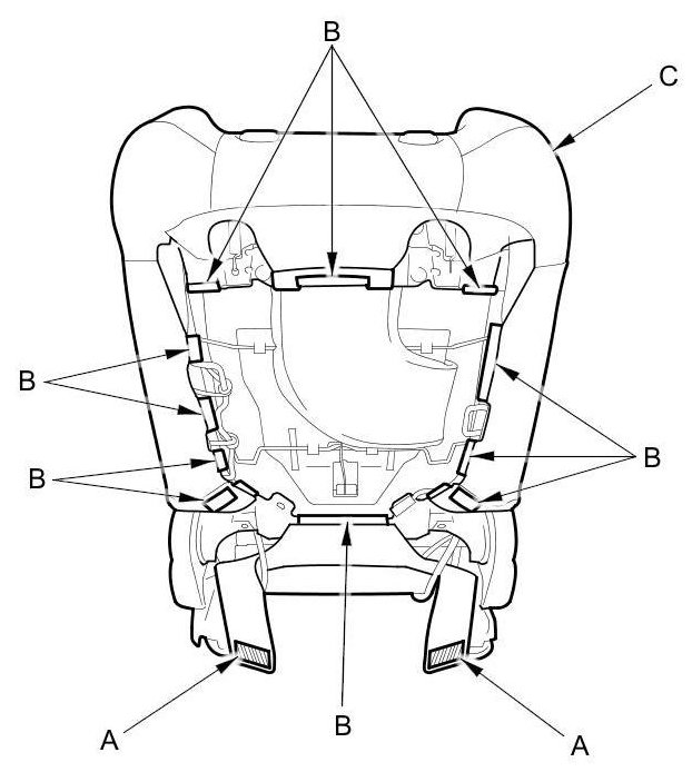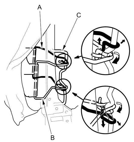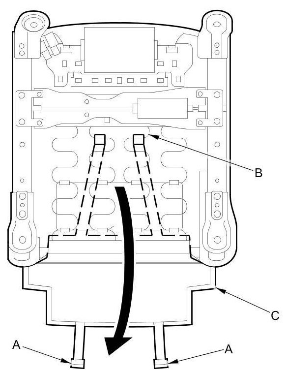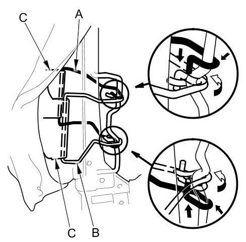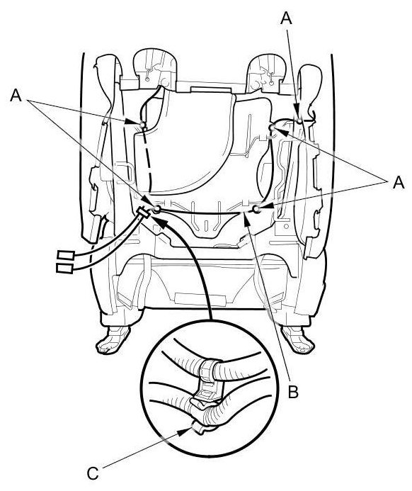 - Before installing the seat-back cover, make sure airbag attachment wires A, B are installed in the reinforcing cloths (C) correctly.