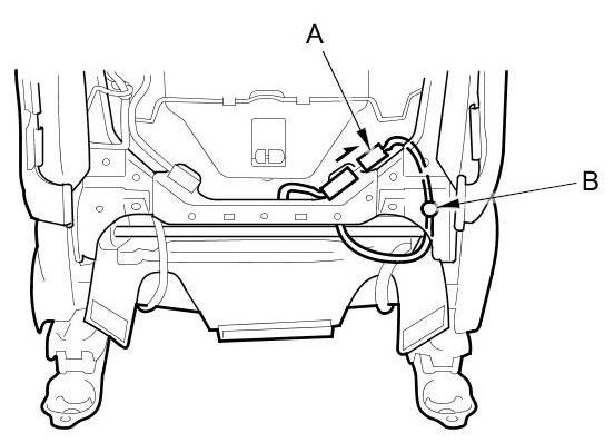 - Reinstall airbag attachment wires A, B securely to the seat-back frame as shown.