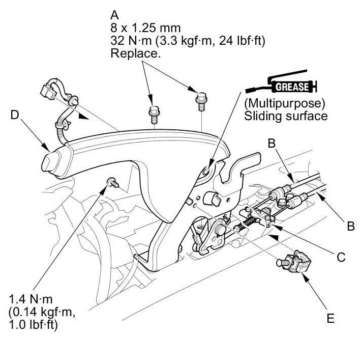 5. Disconnect the parking brake cables (B) from the equalizer (C), then remove the parking brake lever (D).