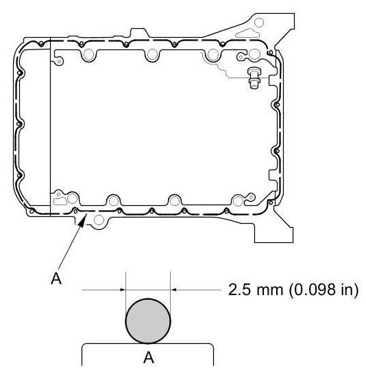 - Apply a 2.5 mm (0.098 in) diameter bead of liquid gasket along the broken line (A).