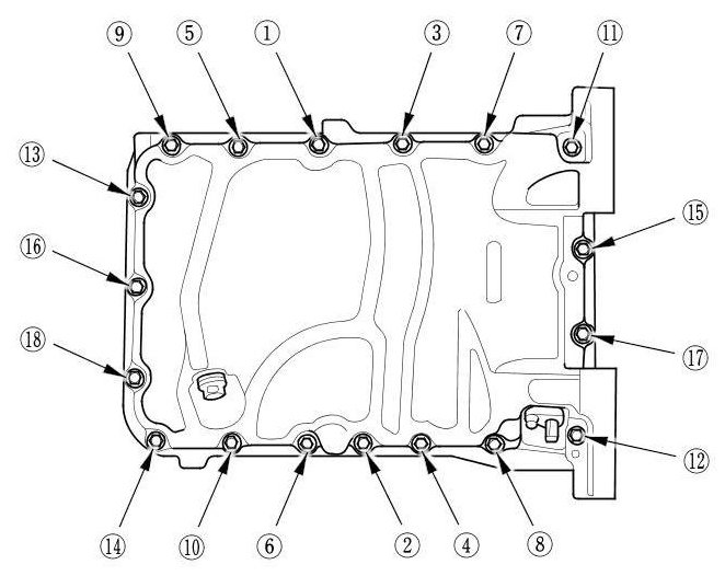 1. Remove all of the old liquid gasket from the oil pan mating surfaces, the bolts, and the bolt holes.