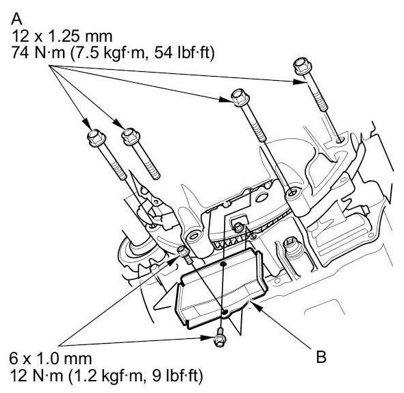 6. Tighten the four bolts (A) securing the transmission, then install the torque converter case cover (B).