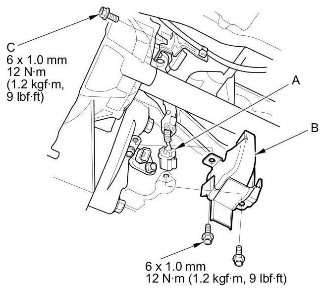 7. Connect the CKP sensor connector (A), then install the CKP sensor cover (B) and the bolt (C).