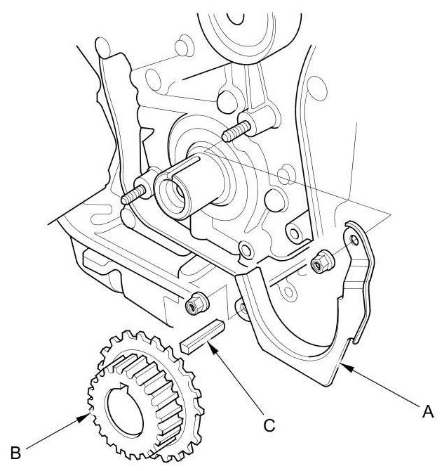 2. Remove the timing belt stopper (A), then remove the timing belt drive pulley (B) and the key (C).