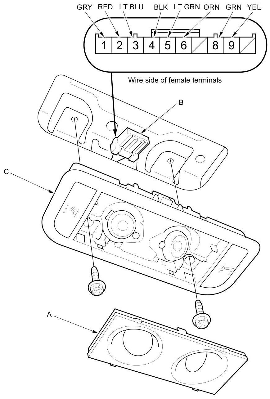 3. Disconnect the 10P connector (B) from the rear individual map light (C).