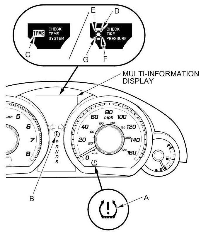 If the system detects low tire pressure in any of the four tires, the low tire pressure indicator and the appropriate tire indicator(s) with the message indicator come on, and the TPMS control unit sets one or more of these codes: DTC 11, 13, 15, 17. When the tire pressure returns to normal, and TPMS control unit receives the normal pressure signal from the tire pressure sensor, the TPMS control unit turns off the indicators.