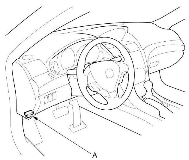 1. With the ignition switch in LOCK (0), or press the engine start/stop button to select the OFF mode, connect the HDS (Honda Diagnostic System) to the data link connector (DLC) (A) located under the driver's side of the dashboard.
