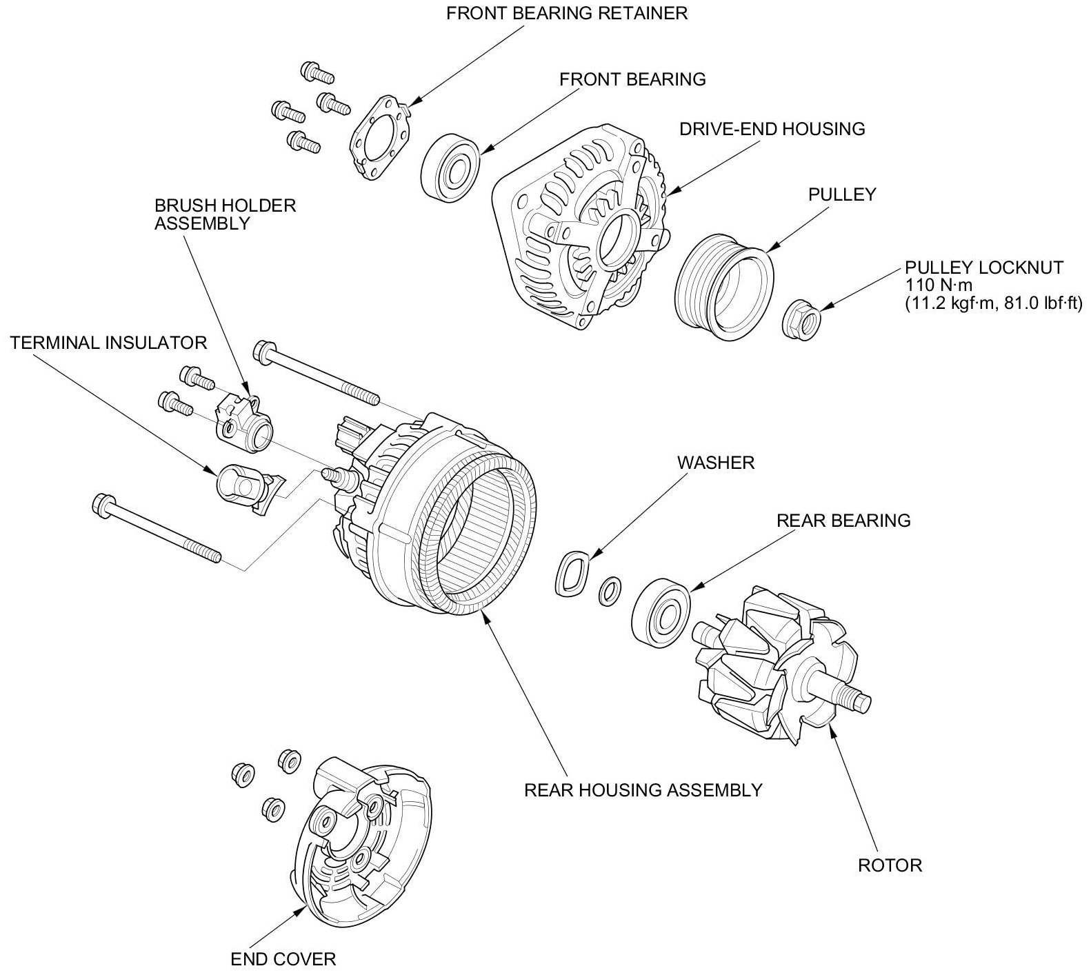 16. If you removed the pulley, put the rotor in the drive-end housing, then torque its locknut to 110 Nm (11.2 kg-m, 81 lb-ft).