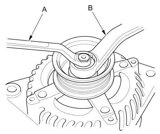 3. If the front bearing needs replacing, remove the pulley locknut with a 10 mm wrench (A) and a 22 mm wrench (B). If necessary, use an impact wrench.