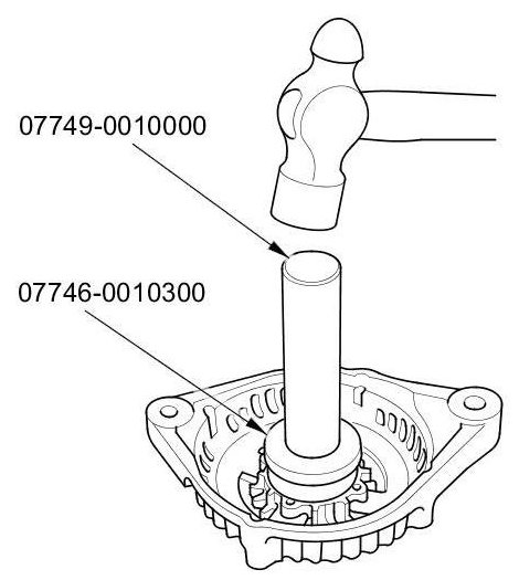 12. Install a new front bearing in the drive-end housing with a hammer, the driver handle, 15 x 135L, and the bearing driver attachment, 42 x 47 mm.