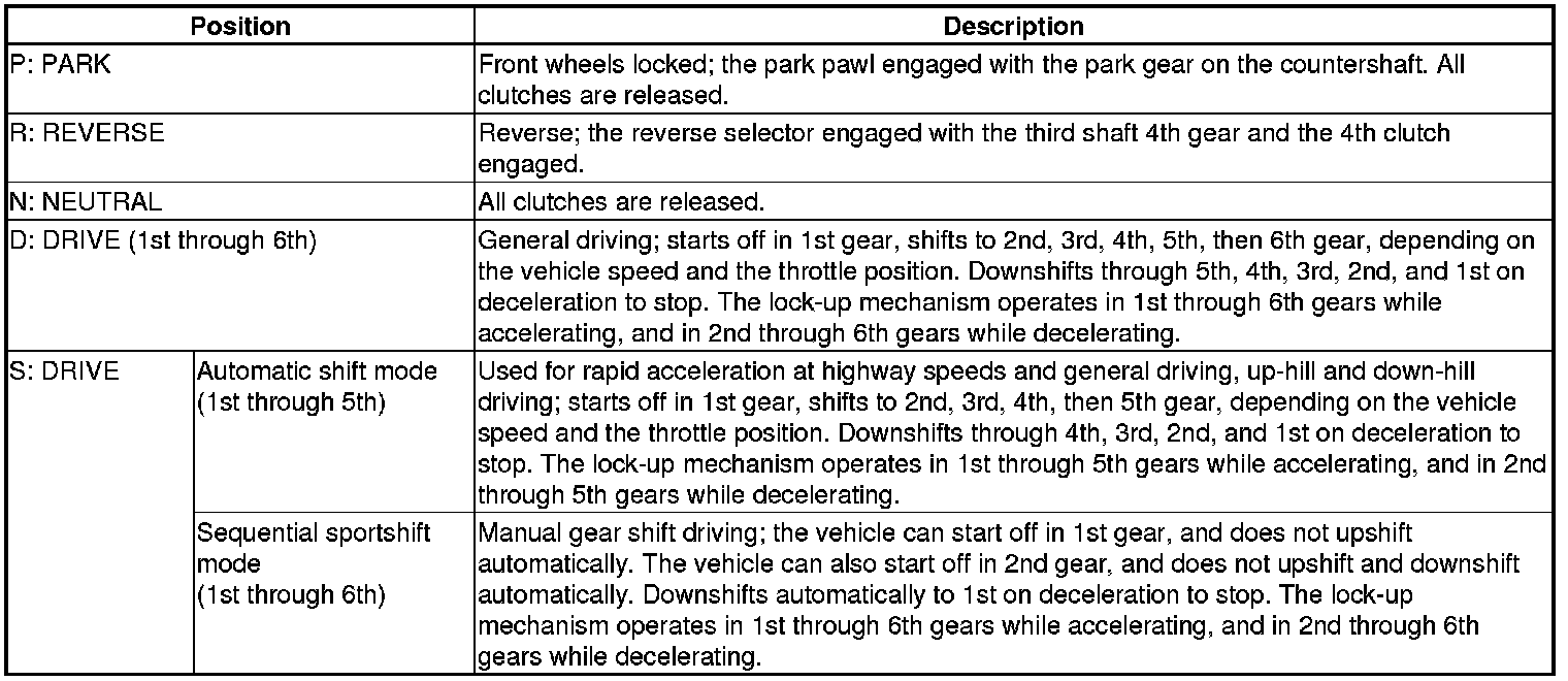 The shift lever has five positions; P: PARK, R: REVERSE, N: NEUTRAL, D: DRIVE 1st through 6th gear ranges with automatic shift mode and D-paddle shift mode, and S: DRIVE 1st through 5th gear ranges with automatic shift mode and 1st through 6th gear ranges with sequential sportshift mode.