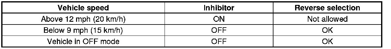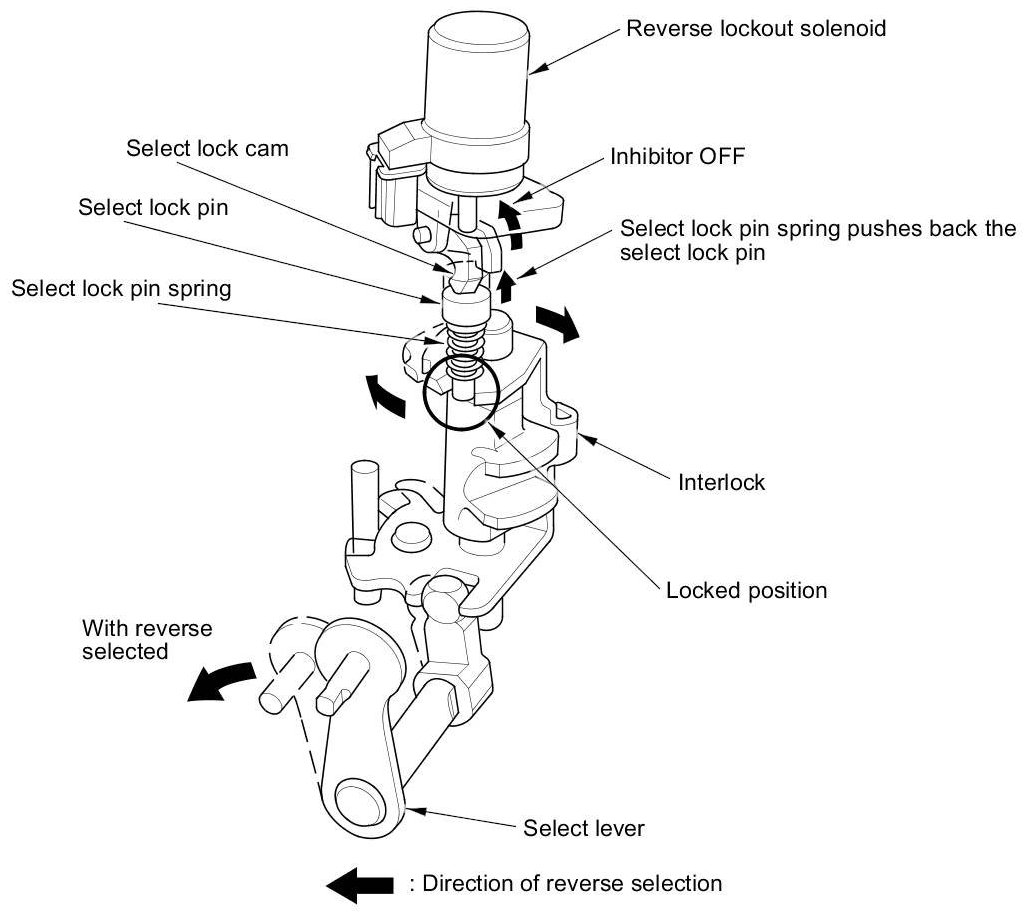At vehicle speeds of 12 mph (20 km/h) or more, the ECM, which monitors the signals from the output shaft (countershaft) speed sensor, activates the reverse lockout solenoid, which pushes the select lock cam and the select lock pin into the locked position. As a result, the interlock cannot rotate to the reverse select position, making it impossible to engage reverse gear. As the vehicle speed drops to of 9 mph (15 km/h) or less, the ECM turns off the reverse lockout solenoid. The select lock pin spring pulls back the select lock pin, enabling the interlock to move freely so reverse gear can be selected.