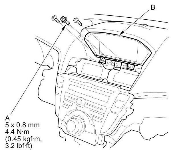 2. Remove the screws and bolt (A) from the navigation display unit (B).