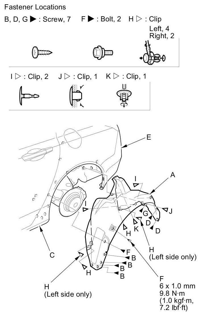 3. Remove the bolts (F) and the screw (G), and detach the clips (H, I, J, K) from the rear wheel arch.