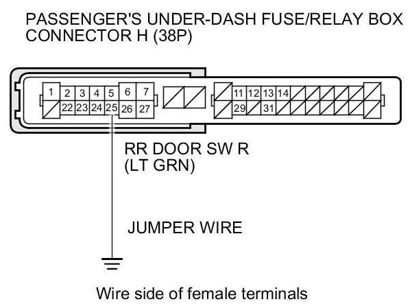 12. With SH-AWD: Connect passenger's under-dash fuse/relay box connector H (38P) terminal No. 25 and body ground with a jumper wire.