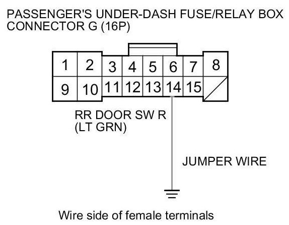 Without SH-AWD: Connect passenger's under-dash fuse/relay box connector G (16P) terminal No. 14 and body ground.