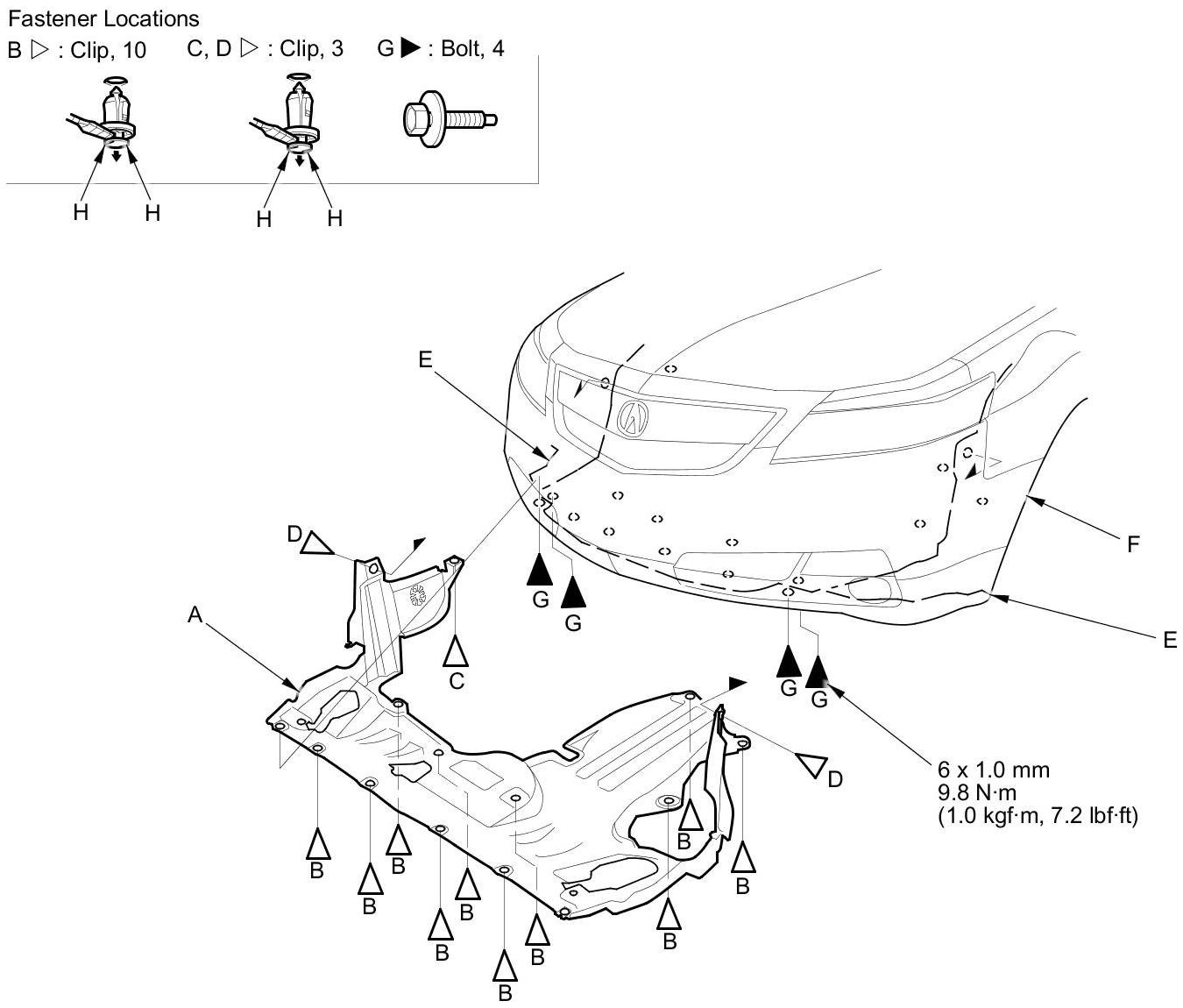 3. From under the front bumper (F), remove the bolts (G) that secure the front bumper, and the front splash shield to the body.