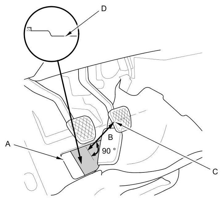 6. Pull back the carpet, and find the cutout (A) in the insulation. Measure the pedal height (B) from the left side middle of the pedal pad (C) to the floor (D) without the insulation.