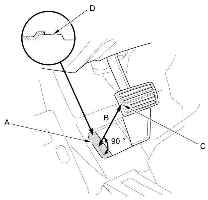 1. With the ignition switch in LOCK (0), or press the engine start/stop button to select the OFF mode, inspect the free play (A) at the brake pedal pad (B) by pushing the brake pedal by hand. If the brake pedal free play is out of specification, adjust the brake pedal position switch (C). If the brake pedal free play is insufficient, it may result in brake drag.