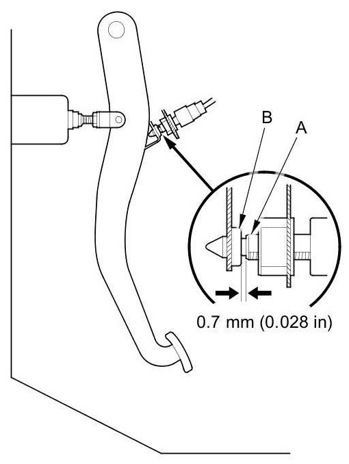 8. Lift up on the brake pedal by hand. Push in the brake pedal position switch until its plunger is fully pressed (threaded end (A) touching the pad (B) on the pedal arm). Turn the switch 45 ° clockwise to lock it. The gap between the brake pedal position switch and the pad is automatically adjusted to 0.7 mm (0.028 in) by locking the switch. Make sure the brake lights go off when the pedal is released.
