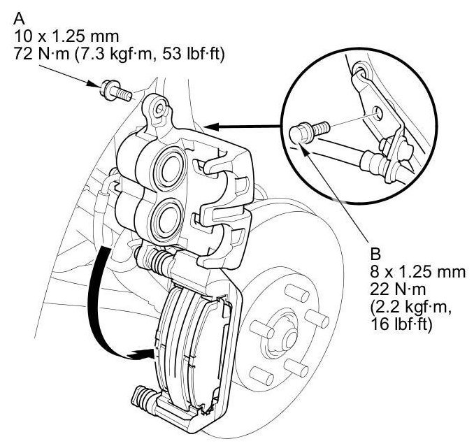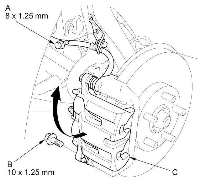 5. Remove the flange bolt (B), and pivot the caliper body (C) up out of the way. Check the hose and the pin boots for damage and deterioration.