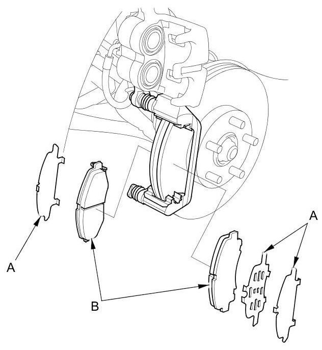 3. Check the thickness (A) of the inner pad (B) and the outer pad (C). Do not include the thickness of the backing plate.