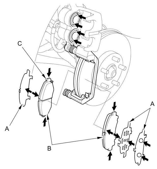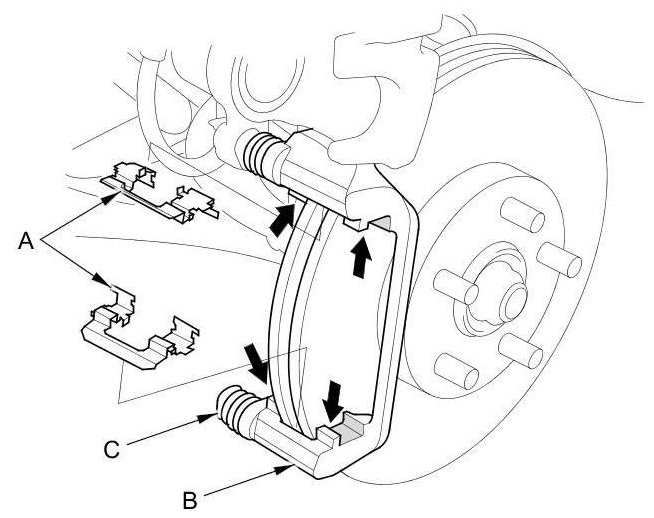 16. Install the brake pads and pad shims correctly. Install the brake pad with the wear indicator (C) on the upper inside position. If you are reusing the brake pads, always reinstall the brake pads in their original positions to prevent a temporary loss of braking efficiency.