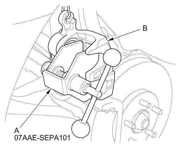 12. Install the brake caliper piston compressor tool (A) on the caliper body (B).