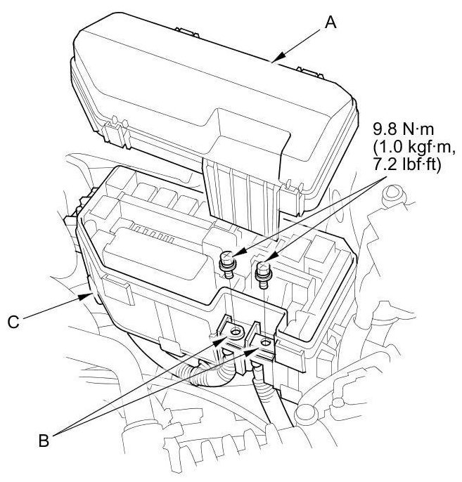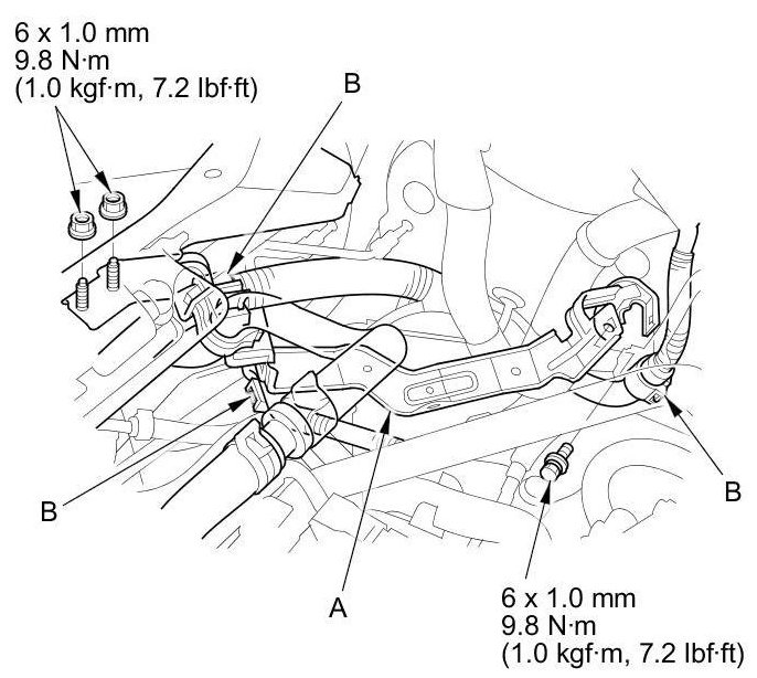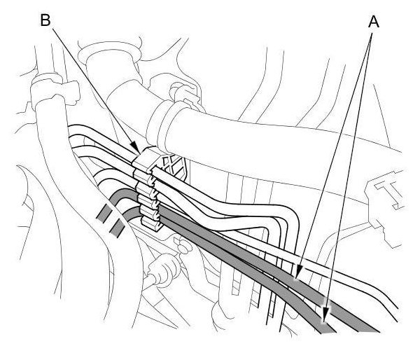7. Remove the under-hood fuse/relay box bracket (A), then remove the engine wire harness clamps (B).