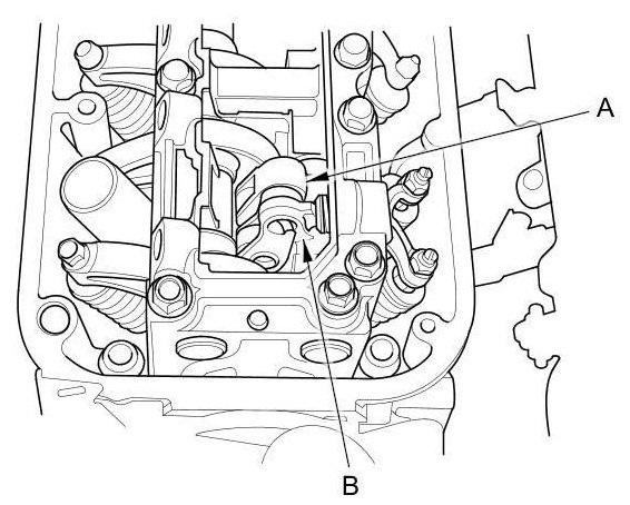 3. Rotate the crankshaft pulley clockwise. Make sure that the intake primary rocker arm (A) and the intake secondary rocker arm (B) are separated and that the intake primary rocker arm should move independently: