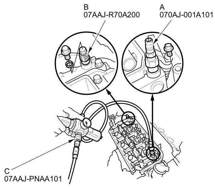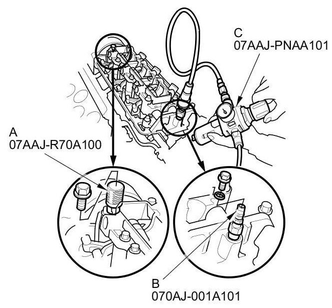 7. Remove the sealing bolts, then install VTEC air stop tool A and the VCM air adapter (B) to the inspection hole, then connect the air pressure regulator (C) as shown.
