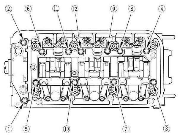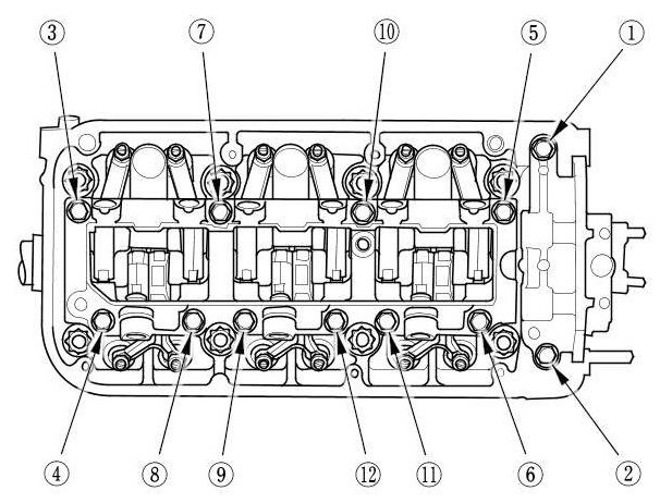 1. Loosen the rocker shaft bridge mounting bolts and the rocker shaft holder mounting bolts in sequence two turns at a time, to prevent damaging the valves or the rocker arm assembly.