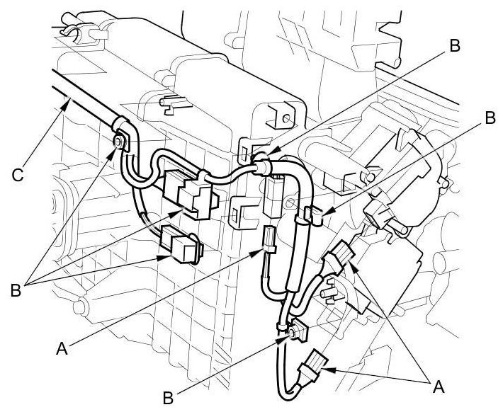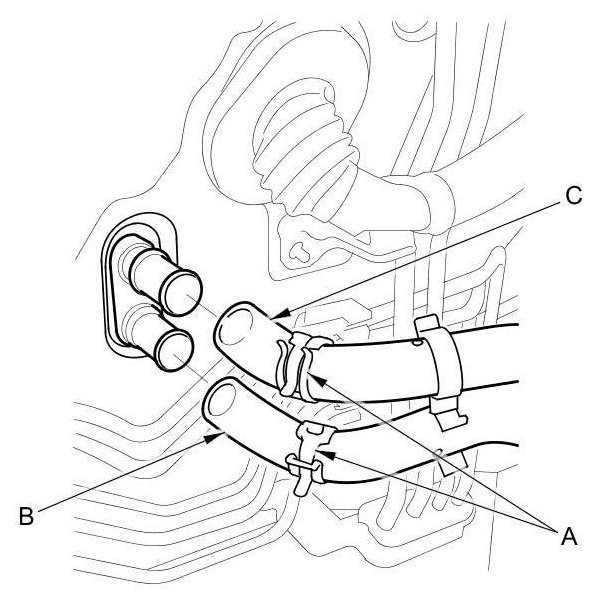 5. From under the hood, slide the hose clamps (A) back. Disconnect the inlet heater hose (B) and the outlet heater hose (C) from the heater unit. Note the layout of the hoses.
