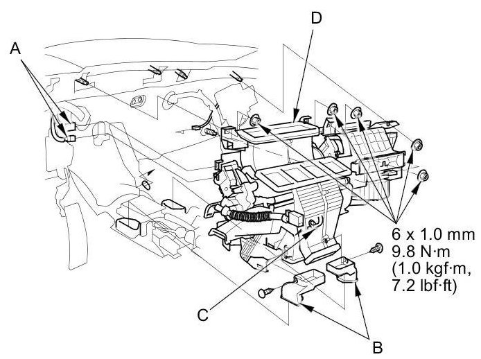 8. Disconnect the left engine compartment wire harness connectors (A). Remove the ducts (B), and the drain hose (C). Then remove the mounting nuts, and the blower-heater unit (D).